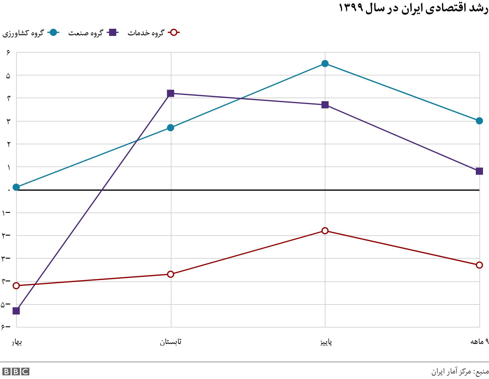 اما رشد ناچیز اقتصاد ایران در فصل پاییز نتوانسته بود رشدهای منفی نیمه نخست سال را جبران کند و کماکان رشد ۹ ماهه اقتصاد ایران منفی (۱.۲- درصد) بود.