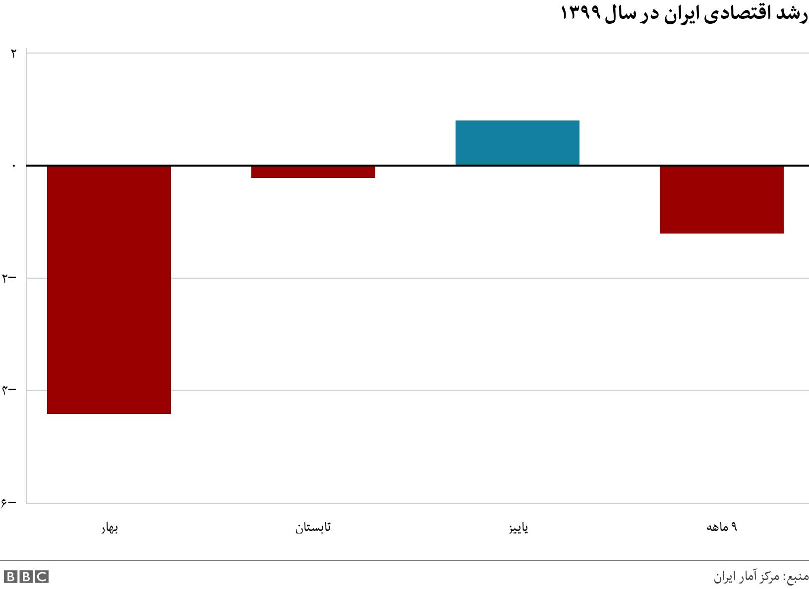 گزارش مرکز آمار ایران از نرخ رشد اقتصادی ۹ ماهه که آخرین گزارش رسمی از وضعیت کلان اقتصاد ایران در سال ۹۹ بود نشان میداد که نرخ رشد اقتصادی فصل پاییز به ۰.۸ درصد رسیده است. آخرین باری که نرخ رشد فصلی اقتصاد ایران مثبت اعلام شده بود به بهار سال ۹۷ باز میگشت و از آن پس در تمام ۹ فصل تا پاییز ۹۹ اقتصاد ایران کوچکتر شده بود.