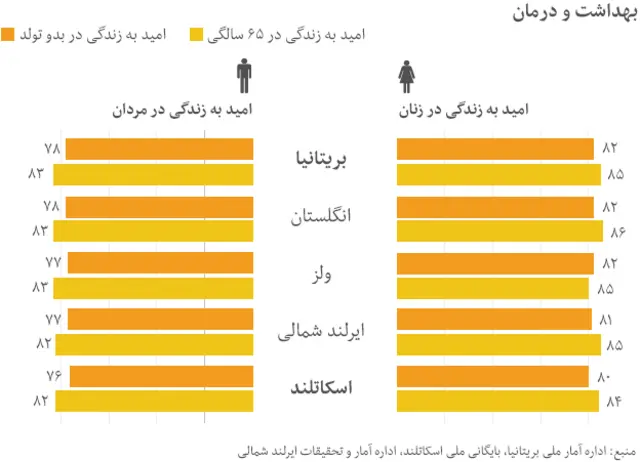 طبق تازه ترین آمار مربوط به امید به زندگی (متوسط طول عمر) انتظار می رود مردانی که در سال ۲۰۱۰ در اسکاتلند متولد شده اند، ۷۶ سال عمر کنند که ۶۰ سال آن وضعیت سلامتی شان خوب خواهد بود. زنانی که در سال ۲۰۱۰ به دنیا آمده اند، به طور متوسط ۸۰ سال عمر می کنند که ۶۴ سال آن را به سلامت هستند. امید به زندگی در کل بریتانیا کمتر است. اسکاتلند جزو آن دسته کشورهایی است که کمترین میزان امید به زندگی را در اروپای غربی دارند.