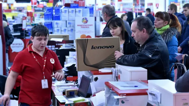 در همین حال مردم روسیه که نگران کاهش ارزش روبل هستند، به مغازهها و فروشگاهها هجوم بردهاند تا پیش از کاهش بیشتر ارزش روبل، پول خود را مصرف کنند.