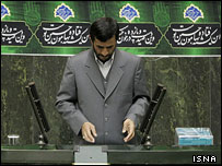 شورای امنيت يک ماه پيش قطعنامه ای عليه فعاليت های هسته ای صادر کرده ولی به گفته آقای احمدی نژاد اين قطعنامه تاثيری بر اقتصاد و سياست ایران نخواهد گذاشت. به گفته وی، "دشمنان می خواهند اين طور القا کنند که با صدور قطعنامه و اعمال تحريم، ايران بايد هزينه های زيادی بپردازد ولی ما تا کنون هزينه ای نپرداخته ايم." رئيس جمهوری ايران تحريم را جنگ روانی و تبليغاتی دشمن دانسته که به گفته وی "در برخی ها نيز اثر گذاشته و فکر می کنند که جنگ است، اين حرف ها کدام است، آنها که هميشه در دنيا دم از جنگ می زدند در مقابل ايران جا زده اند." آقای احمدی نژاد در عين حال گفته است:" ما برای هر شرايطی خودمان را آماده کرده ايم و بودجه ای که تقديم مجلس شده است پيش بينی کرده ايم که اقتصاد و سرمايه گذاری و رشد اقتصادی داخلی کوچک ترين تاثيری از تحولات بيرونی نپذيرد." رئيس جمهور ايران کاهش قيمت نفت در بازارهای جهانی را توطئه دشمنان دانسته که "نتوانسته اند با قطعنامه به ايران آسيب بزنند و با کاهش بهای نفت می خواهند به اين کشور آسيب بزنند در حالی که ما با تعيين قيمت پائين برای نفت در بودجه آمادگی خود را اعلام کرده ايم." به گفته وی "ما به دشمنان می گوئيم که آماده ايم و اگر بهای نفت را هم کاهش دهند ما کار خود را خواهيم کرد." |