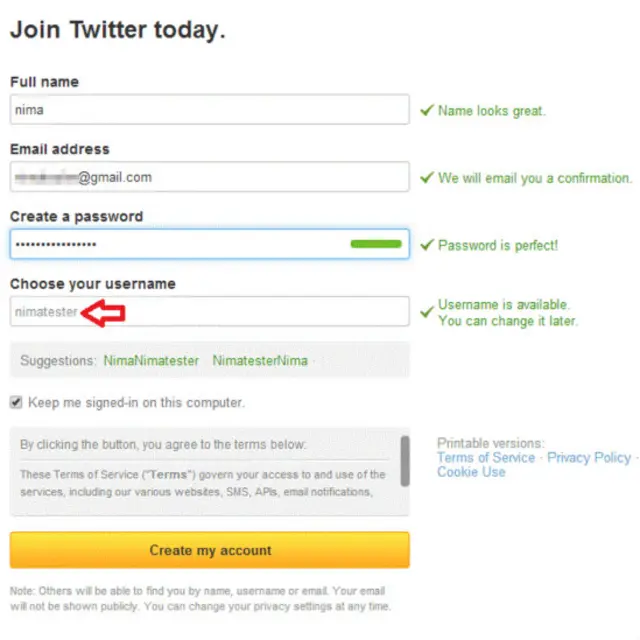 وارد صفحهای به شکل زیر خواهید شد که مشخصات بیشتری از شما میخواهد. اینجا باید شناسهای را برای توییتر خود انتخاب کنید (بخشی که با پبکان قرمز در تصویر زیر مشخص شده است).