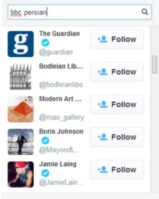 در شکل زیر در جعبه جستوجو bbc persian را وارد کردهایم تا شناسههای مرتبط با آن را بیابیم.