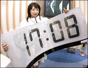 کارمند شرکت ساعت سازی 'سيتيزن' ژاپن اولين ساعت قابل انعطاف ديجيتالی را که قطر آن سه ميليمتر است و از کاغذهای الکترونيکی ساخته شده را در نمايشگاهی در توکيو نشان می دهد که اين شرکت سعی دارد اين محصول را به صورت تجاری تا سال آينده به بازار عرضه کند.
