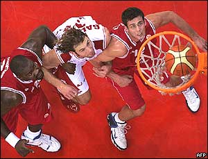 صحنه ای از مسابقات بسکتبال ليگ اروپا بين دو تيم 'المپياکوس' و 'ای جی ميلان'، در ورزشگاه صلح و دوستی نزديک آتن