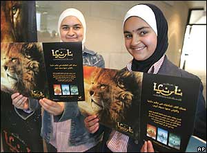 انتشار کتاب نارنيا کرونيکلز به زبان عربی در اردن: اين داستان به 41 زبان ترجمه شده است و در عکس دختران اردنی که پوسترهای ويژه عربی زبان نارنيا کرونيکز را در دست دارند نشان داده می شوند.