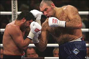 بوکسور آمريکايی جان رويز - چپ - در مقابل نيکولای والويف از روسيه در جريان مسابقات قهرمانی بوکس سنگين وزن جهان. والويف برنده مسابقه شد.