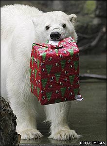يک خرس قطبی به نام پايک که در باغ وحش شهر سانفرانسيسکوی آمريکا کادوی کريسمس خود را به دندان گرفته است. امسال حيوانات باغ وحش سانفرانسيسکو به عنوان هديه سال نو، هديه های خوراکی را در بسته های کادوپيچی شده در يافت کردند.
