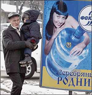 مردی با بچه اش در بغل، جلوی پوستر آگهی آب نوشيدنی در شهر خابارفسک در روسيه ديده می شود که اشاره ای است به نگرانی آلودگی آب رودخانه اين شهر. انفجار کارخانه ای در چين ماه قبل باعث جريان يافتن آب آلوده به اين شهر شد.