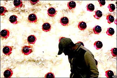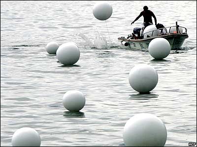 توپهای پلاستيکی سفيد رنگ در مقابل سالن تئاتری در سنگاپور به مناسبت جشن سال نو به آب انداخته می شود.