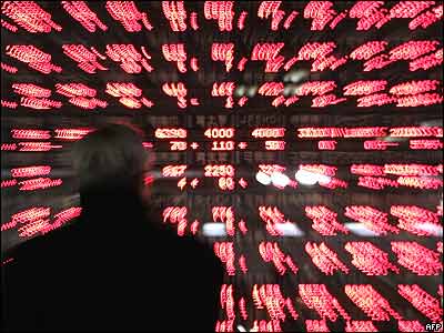 مردی در حال نظاره تابلو الکترونيکی اعلان قيمتهای سهام در شرکتی در توکيو.