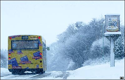 اتوبوسی در ميان برف و بوران در روستايی در انگلستان