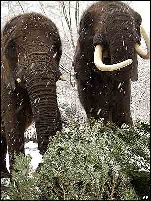 ژومبا در سمت چپ و سارا در سمت راست، در باغ وحش شهر روستاک در شمال آلمان، در حال خوردن درخت کريسمس هستند. سالانه در سراسر اروپا درختان کريسمس به فهرست غذای حيوانات باغ وحش اضافه می شود.