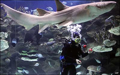 شعبده باز آمريکايی اشريتا فورمون در حال اجرای برنامه زير آب. آقای فورمون نتوانست رکورد قبلی خودش را که توانسته بود توپ ها را به مدت 37 تا 45ثانيه در عمق زياد تر از پنج متر به هوا پرتاب کند، بشکند