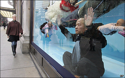 وانگ کينگسونگ، هنرمند چينی، در ويترين فروشگاه سلفريجز لندن نشسته است. او تمام ويترين های اين فروشگاه بزرگ و معروف را با آثار هنری تزئين کرده که موضوع آن 'اشتها'ی مردم سراسر جهان برای خريد است.