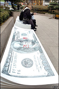 يک نيمکت پلاستيکی به شکل دلار آمريکايی جلوی ساختمان بورس در سئول، پايتخت کره جنوبی