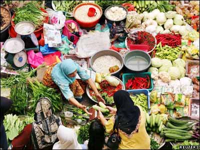 يک زن دستفروش در يکی از بازارهای شهر کوتا بارو در مالزی ميوه و سبزی می فروشد.