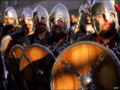 مردان 'شتلاندی' در شمال اسکاتلند لباس وايکينگ ها را پوشيده و در خيابان های شهر لرويک رژه می روند. |