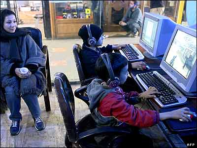 يک مادر ايرانی در حال تماشای فرزندانش که مشغول بازی های رايانه ای، در يک مرکز تجاری در تهران هستند.