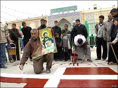 يک مرد عراقی در حال ترسيم پرچم دانمارک، در اعتراض به چاپ کاريکاتورهايی از پيامبر اسلام در يک نشريه دانمارکی، در جلوی در ورودی حرم امام علی در نجف.