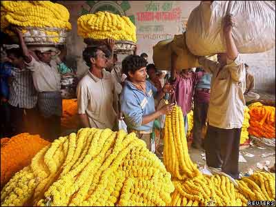 کشاورزان هندی در حال آمادگی برای فروش گل در بازار گل کلکته. از گل در مراسم مذهبی هندوها استفاده می شود.
