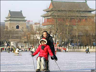 يک زوج در حال تفريح روی يک در ياچه يخ بسته در پکن ، چين
