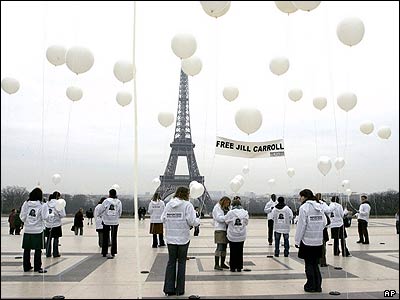 گروهی از معترضين برای پشتيبانی از گزارشگر آمريکايی جيل کارول که در ماه ژانويه در عراق ربوده شد، جلوی برج ايفل پاريس تجمع کرده و با نگه داشتن بادبادک های سفيد رنگ خواستار آزادی وی شده اند.