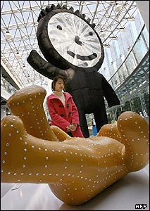 يک دختر چينی در حال تماشای يک مجسمه بنام "خرس عزيز" است. اين مجسمه در نمايشگاه به عنوان "عشق@قصه" در موزه هنرهای معاصر شهر شانگهای برای بازديد عموم ارائه شده است. |