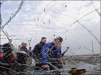 حمله يک جوان فلسطينی به يک سرباز اسراييلی با قلوه سنگ: سرباز اسرائيلی در کنار کليسای "مريم مقدس" واقع در شهر نابلوس، در حال گشت زنی است.