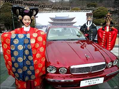 سه مدل کره جنوبی با لباس های سلطنتی سنتی شان برای آگهی مدل جديد ماشين جاگوار XJ3.0 که از فردا در بازار عرضه خواهد شد، در کنار ماشين عکس می گيرند.