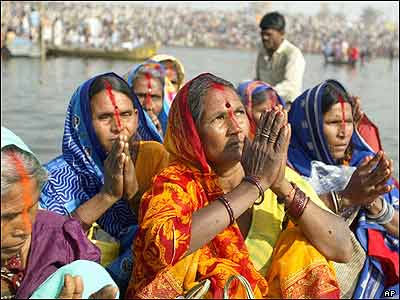 گروهی از زنان زاهد هندو در حال دعا کردن به مناسبت روز خجسته بدر در دوران مقدس "مق ملا"، يکی از دوران های تاريخی مقدس در هند، در محل تلاقی رودهای گنگ، يامونا و ساراسواتی در شهر الله آباد هند هستند.