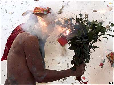 يک مرد تايوانی در ميدانی در شهر تايتونگ نزديکی شهر تايپه، پايتخت تايوان که به مناسب جشن فانوس چينی "سوزاندن اعجوبه ها" آتش بازی می کنند.