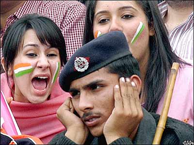 يک دختر هندی که در بازی کريکت بين پاکستان و هند در استاديوم قذافی در شهر لاهور، پايتخت پاکستان شرکت کرده، در گوش يک پليس پاکستانی برای پيروزی تيمشان فرياد می زند.