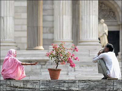 يک زوج هندی جلوی در ورودی ساختمان مرمری "يادبود ويکتوريا" که يکی از مهم ترين بناهای ديدنی برای جهانگردان در شهر کلکته (کولکته) هند است، نشسته اند. اين محل همچنين عاشقان و معشوقان را برای ديدار و ملاقات به خود جذب می کند.