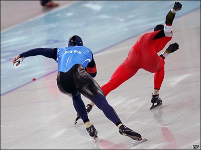 پکا کوسکلا از فنلاند و لی يو از چين در مسابقات دوی 500 متر روی يخ مردان در المپيک زمستانی در شهر تورين. |