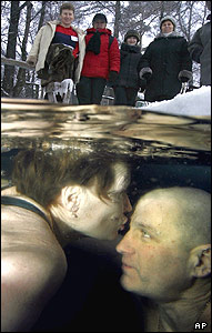 يک زوج در ميدان سن پترزبورگ مسکو در روز والنتاين، زير آب يخ زده يکديگر را می بوسند.