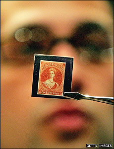 يکی از کارکنان مرکز حراج اشياء آنتيک 'ساتبی' در لندن، تمبری قديمی از کلکسيون فيلاتليک را که بين 30 تا 35 هزار پوند ارزش گذاری شده، نشان می دهد.