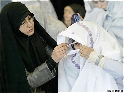 امروز در نماز جمعه تهران: يک مادر به دخترش برای گذاشتن مقنعه اش کمک می کند. آيت الله جنتی امروز شورای امنيت را "شورای سلب امنيت" خواند، و گفت که غرب از اين شورا مانند يک مترسک برای ترساندن ديگر کشورها استفاده می کند.