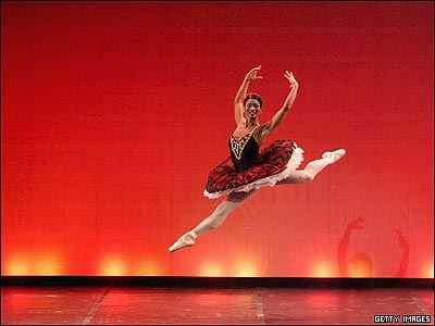 يک بالرين از گروه باله "گرانديوا" در حال اجرای نمايش در تاتر "لا فنيس" در شهر ونيز ايتاليا. اين گروه به دليل اجرای رقص های مختلف باله به سبک قرن ۱۹ و ۲۰ ميلادی و همچنين اجرای طنزآميز رقص های مدرن، معروف است.