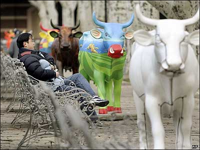 يک مرد در کنار مجسمه های گاو رنگی در نمايشگاهی موسوم به "رژه گاو" در شانگهای چين. هر کدام از اين ۲۵ گاو نشانگر يکی از کشورهای عضو کميسيون اروپاست. اين برنامه، به گفته ترتيب دهندگان آن، تلاشی برای نزديکی اعضای اتحاديه اروپا به شهروندان آنهاست.