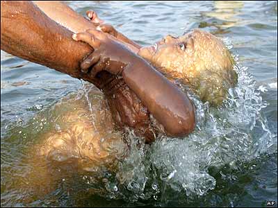 در جريان مراسم سالانه "مق ملا" در هند، يک مرد بچه ۱۷ ماهه اش را در رود گنگ برای اجرای سنت سالانه غسل می دهد.