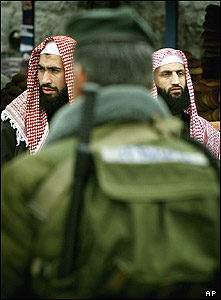 دو فلسطينی در مقابل دروازه دمشق در بيت المقدس. اين دو نفر منتظرند تا از جلوی یک سرباز اسراییلی بگذارند و در نماز روز جمعه شرکت کنند.