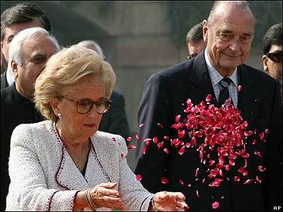 برنادت شيراک، همسر ژاک شيراک رييس جمهور فرانسه، در حال ريختن گلبرگ بر مزار مهاتما گاندی. ژاک شيراک برای يک ديدار رسمی به هند سفر کرده است.
