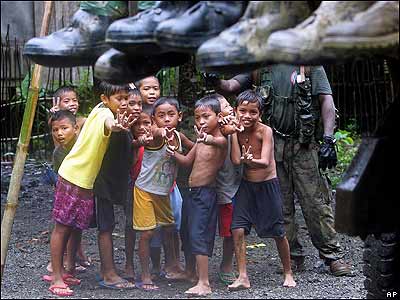 کودکان فيليپينی در حال تماشای تفنگداران دريايی آمريکا که در پی رانش زمين در جنوب شرقی مانيل به آن کشور اعزام شده اند. به دليل بارش باران سنگين در اين منطقه، عمليات نجات که کشورهای مختلفی در آن شرکت دارند، به طور موقت، متوقف شده است.
