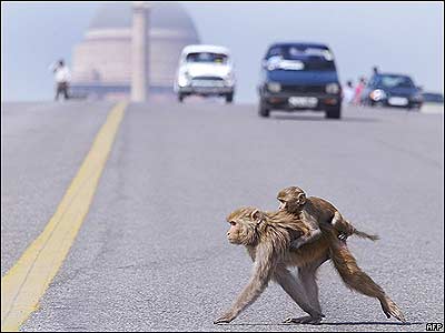 ميمونی در حال گذر از عرض خيابان در مقابل کاخ رياست جمهوری هند در دهلی نو. تعداد ميمون ها - که در مذهب هندو، مورد احترام هستند - در سال های اخير در پايتخت هند، چنان زياد شده که دولت اقدام به تشکيل گروهايی ويژه برای جلوگيری از خرابکاری های آنها در ساختمان های دولتی کرده است. |