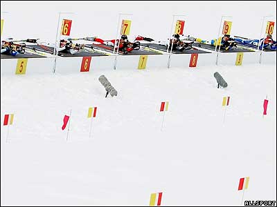نمايی از مسابقه دوگانه زنان - ترکيب اسکی و تيراندازی - در چارچوب بازی های المپيک زمستانی 2006 در ايتاليا