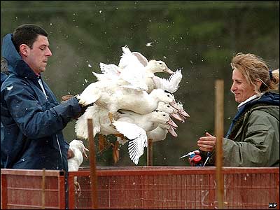 يک دامپزشک در حال واکسينه کردن غازها در يک مرکز پرورش مرغ در فرانسه، در پی گسترش آنفلوانزای مرغی در اروپا.