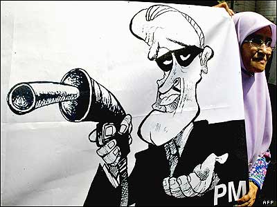 يکی از معترضين در شهر کولالامپور، پايتخت مالزی کاريکاتور عبدالله احمد بدوی، نخست وزير مالزی را حمل می کند. گزارش می شود که دولت با افزايش بسيار بالای نرخ سوخت باعث نارضايتی مردم مالزی شده است.