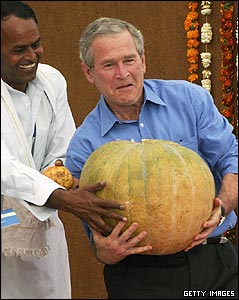جورج بوش، رئيس جمهوری آمريکا، در طی سفر سه روزه اش به هند، از دانشکده کشاورزی در شهر حيدرآباد ديدار کرده و کوشش می کند تا يک کدوی بزرگی را بلند کند. هدف از سفر جورج بوش به اين کشور گسترش روابط اقتصادی دو طرفه و توافقی برای توسعه صنايع غيرنظامی اتمی هند است.