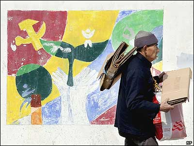 مرد فقيری از جلوی پوستر حزب کمونيست چين در شهر شانگهای می گذرد. روزنامه اصلی حزب کمونيست چين در جريان نشست سالانه پارلمان اين کشور گزارش می دهد که شکاف بين ثروتمندان و فقرا در چين در حال افزايش است.
